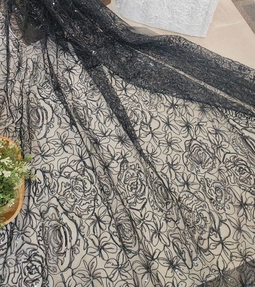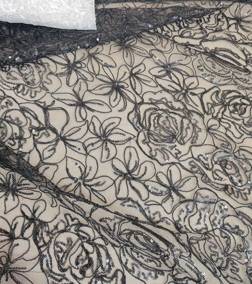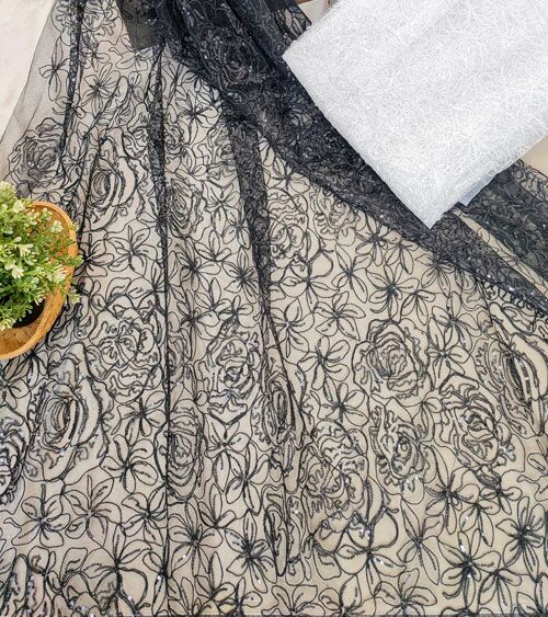 Imported Net Fabric With Corded Floral Embroidery And Sequins