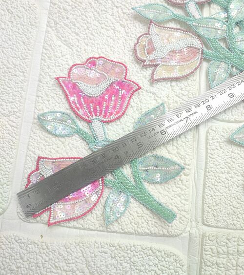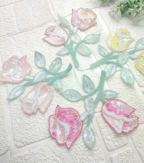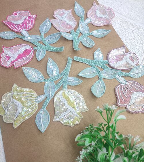 Super Cute And Pretty Tulip Design Embroidery Applique Embellished With Sequins/Moti Carved To Perfection In Beautiful Color Palette.